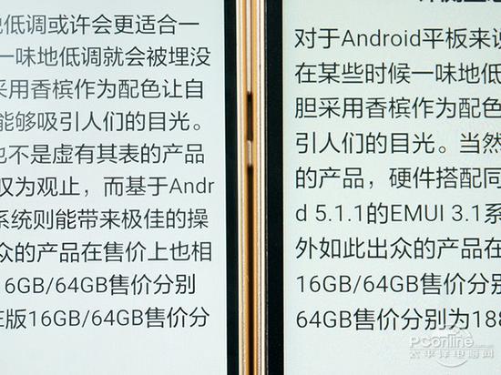 在可视角度的测试中,虽然两者的亮度都有所降低,但没有存在明显的偏色,还能看清屏幕显示的内容。可能很多网友会想到,P8的5.2英寸屏幕分辨率为 1080p级别,ppi为423,而P8max的屏幕尺寸增至6.8英寸,但分辨率依然为1080p,导致ppi下降至326,ppi的下降会带来明显的 颗粒感吗?下面我们一起来看看对比。