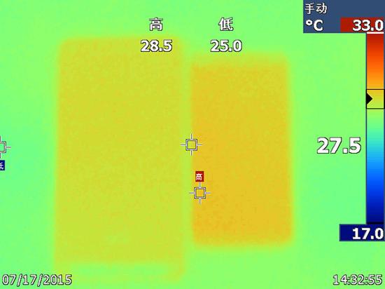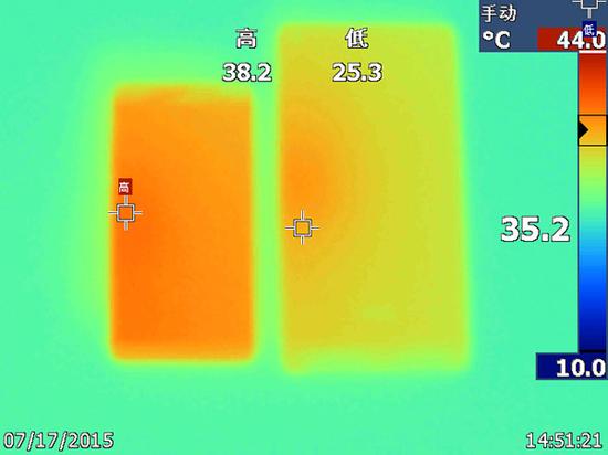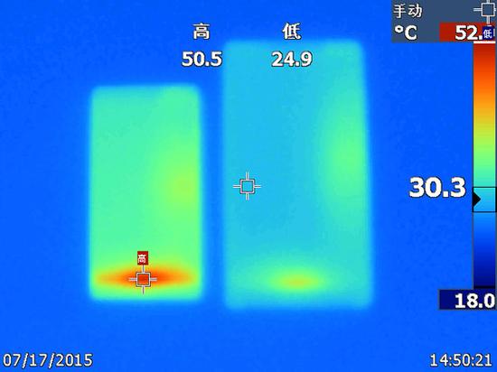 而在游戏测试中,P8的机身温度远远比P8max高,正面最高温度为50.5°,此时处理器降频,游戏出现轻微卡顿。而P8max则表现得好很多,机身背面手摸温度相差较大。