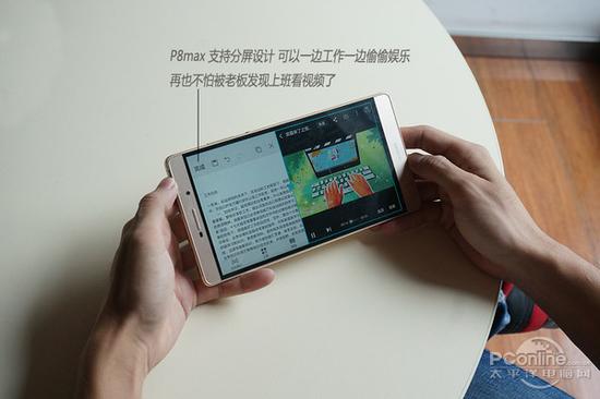 大屏可以说是P8max最明显的优势,充分发挥其大屏幕的优势便是使其与P8体验差异的关键,而软件层面的适配和优化便是常见的做法。比如,P8max 支持双屏显示和操作的体验,进行分屏后可以同时处理文档和观看视频。系统层面对大屏的适配,可以说是提升大屏手机体验的关键。华为针对P8max的系统优 化和P8有什么差异,我们会在后面的部分进行探讨。