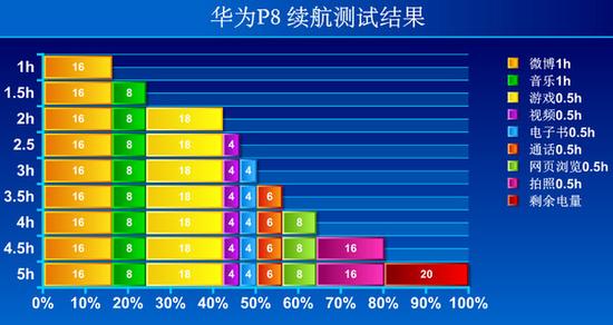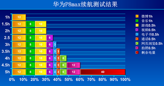 在模拟一般手机用户一天内的使用情况之后,P8的剩余电量为20%,而P8max剩余电量为40%,由此看来P8max的续航性能比P8还要优秀,这不 仅得益于4360mAh的电池,同样手机硬件的智能调频技术、系统的优化都会影响续航性能。所以网友们也无需担心巨大屏幕导致续航能力较弱的这个问题了。 除此之外,P8max还支持反向充电技术。