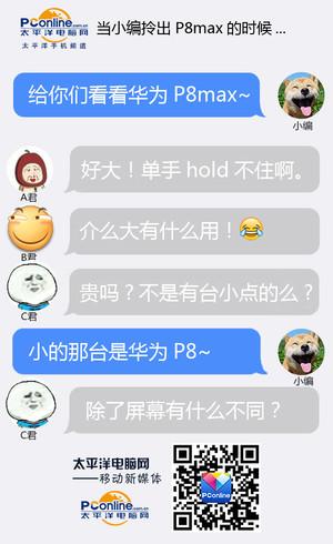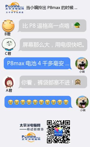 由简短的聊天对白我们可以看出大屏手机(尤其是6.8英寸的P8max)确实比较容易吸引眼球,但是我们也从中发现一般手机用户对于P8max产生的疑问及使用上的顾虑。例如1:手机太大,不方便携带。2.大屏手机功能上有什么特别的地方。3.除了屏幕之外,P8/P8max有何差异。4.屏幕的增大导致耗电量增大,续航表现如何?