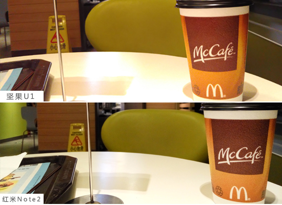 室内弱光下,坚果手机虽然对焦速度不慢,但总体效果并不优秀。虽然从取景器来看对焦点准确,但是实际样张焦平面内细节质感涂抹感严重。对比红米Note2,咖啡杯表面纹理感弱了许多。