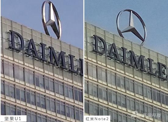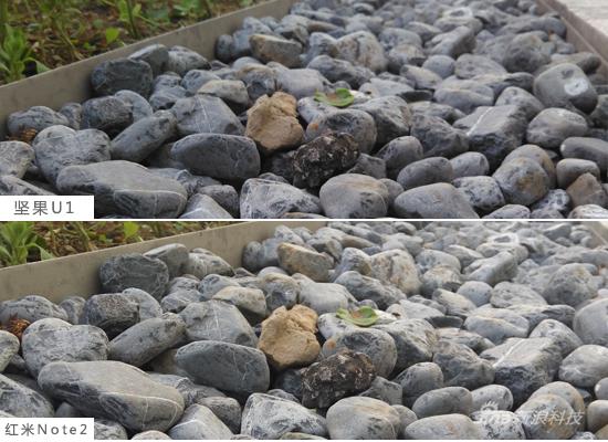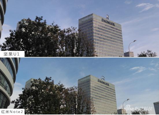 以这张蓝天为例,“那天天气正好,晚霞飘忽于云彩间”于是在整体外景偏紫的情况下,红米Note2搞出了张蓝绿色天空,而坚果手机却比较真实还原场景;不过就是在采光良好下,坚果手机样张放大后涂抹感严重不少,应该是目前版本优化调校问题(发稿前新机仍旧不是稳定版2.0系统)。
