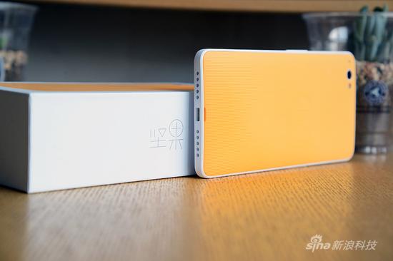 机身采用可更换后壳设计,拥有七种颜色可选,配合背面触点还可自动切换不同颜色主题;如果说此前Smartisan T1在设计上更偏男性化,那么颜色清亮多彩的坚果手机无疑受众更广。背面为聚碳酸酯材质,本着“弱化手机存在感,贴合感更好”这种理念,机壳背面纹理历经多次推倒重来;又为让喷漆附着厚度不至于改变纹理本身细密程度,坚果手机采用薄喷漆工艺。这种对细节追求的连锁效应,无疑会增加设计成本。