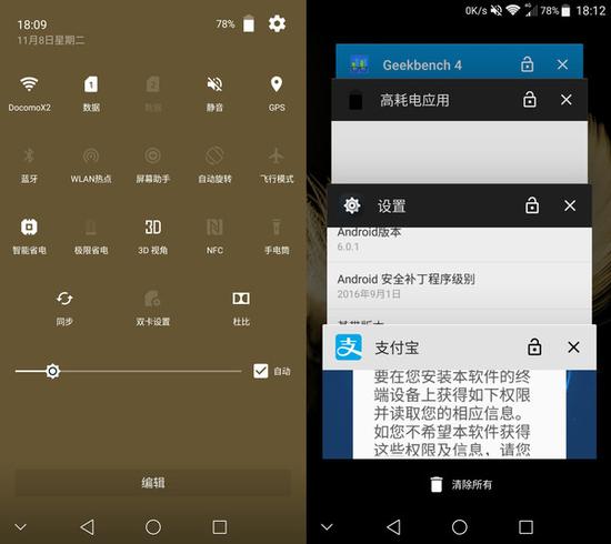 下拉栏和任务切换界面沿用着Android系统的原生风格,多任务切换时整机表现非常流畅。