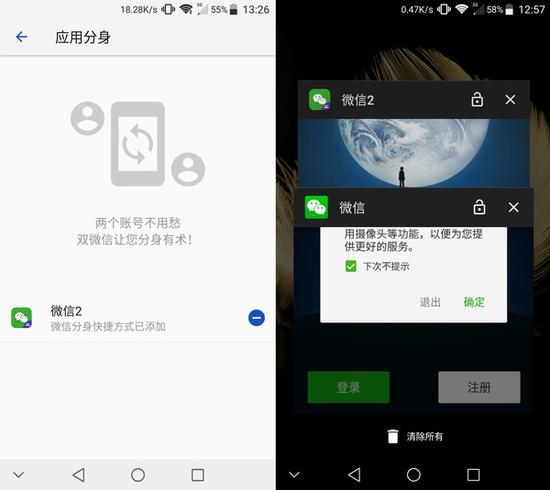 应用分身功能支持将微信等应用进行复制,通过克隆后的应用,用户可以实现在一台机子上登录多个账号。