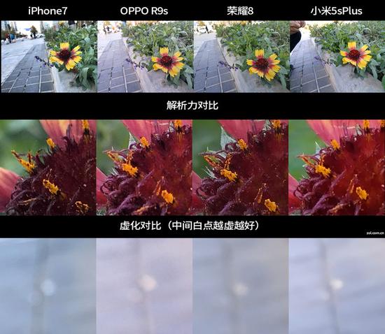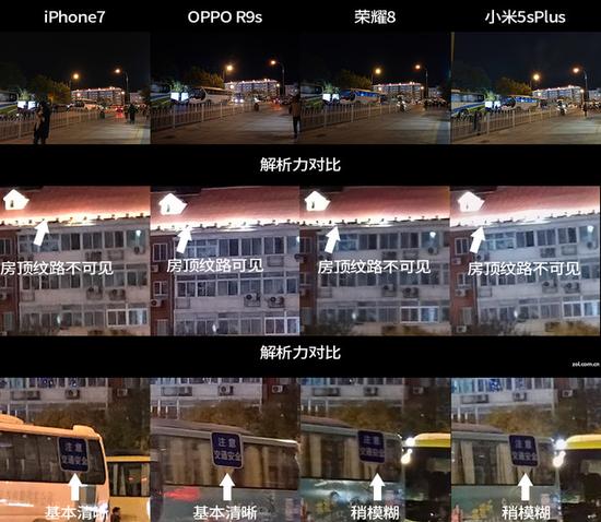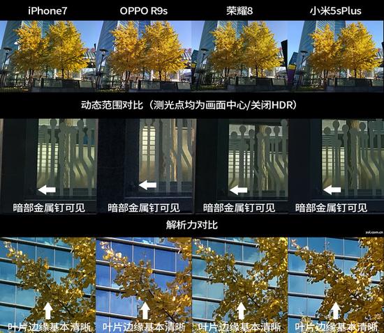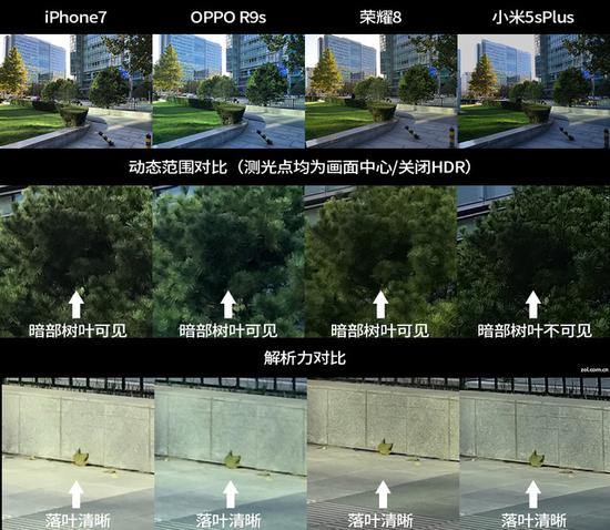 对比选了四部手机,分别是iPhone 7、OPPO R9s、荣耀8和小米5s Plus,前两个是单摄后两个是双摄,两个双摄手机都是黑白/彩色双镜头的组合方式,样张对比: