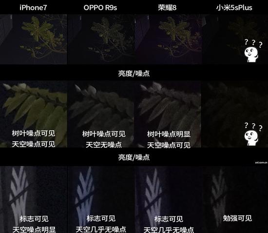可以看到,其实夜晚样张中反倒是两部单摄手机有更好表现,原因是iPhone 7、R9s分别使用了f/1.8、f/1.7大光圈镜头,进光量更大,画面亮度更高,其中,树叶样张中iPhone 7表现出了惊人的画面亮度,远超其他三部手机,秘密就是光学防抖。
