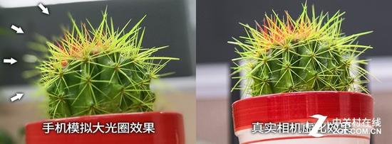 拍摄仙人掌、自行车车条等有尖锐边缘或是轮廓复杂的物体,可以轻松让此功能露出马脚,效果假的绝对不敢发朋友圈。上图单反真实拍摄的仙人掌尖刺,由近到远逐渐模糊,而手机拍摄的照片则把左侧尖刺末端误认为是背景而涂抹掉了,就算是iPhone 7 Plus也有此现象,但苹果聪明地称其为“人像模式”,人像拍摄时人物边缘是很规则的,不易露出破绽。