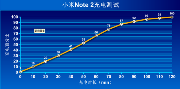 测试结果显示,小米Note 2充满电需要120分钟左右,0至80%电量的充电速率十分快,平均10分钟能充进356mAh电量,30分钟则能充进1068mAh电量。但最后涓流充电时间有些长,不过整体表现还算不错。