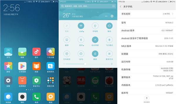 小米Note 2是小米首款采用双曲面屏的手机,但是小米不像三星那样专门为双曲面屏推出相应的功能,而是通过一套主题来实现。换上小米Note 2专属曲面主题后,在锁屏界面上,我们可以通过滑动左侧曲面屏来选择锁屏壁纸,滑动右侧曲面屏则可以进入常用软件、快捷开关、天气等面板。
