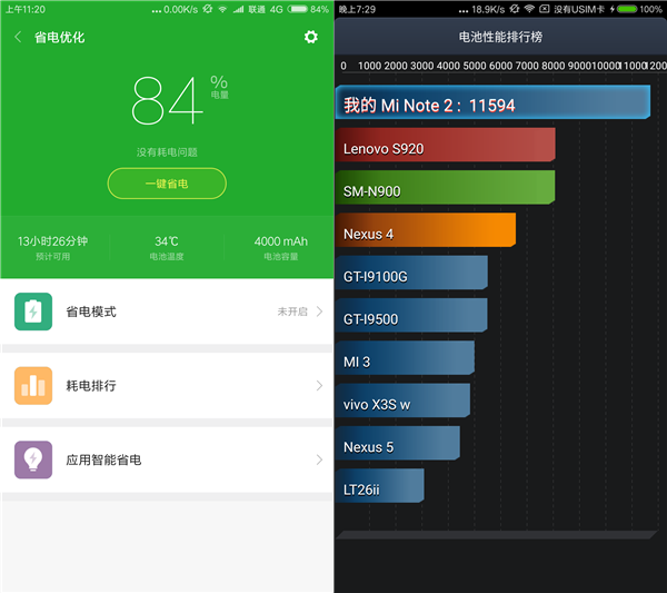 结果显示小米Note 2的续航成绩为11594,在4000毫安大电池的手机中,成绩属于中上。高通骁龙821在高负荷运行的时候功耗还是比较大,而且更大屏幕也更耗电,有这样的表现已经不错了。