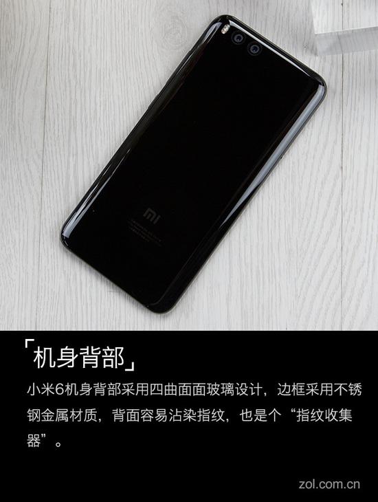 在颜色上,小米6有亮白色、亮蓝色、亮黑色以及亮银色,不过,由于良品率过低,亮银版仅仅在探索阶段,并未实现量产。由于采用了四曲面设计,背板四角位置与金属中框的缝隙有些大,甚至可以插纸,缝隙非常明显,尤其是亮白色、亮蓝色接缝处,破坏机身整体一致性。