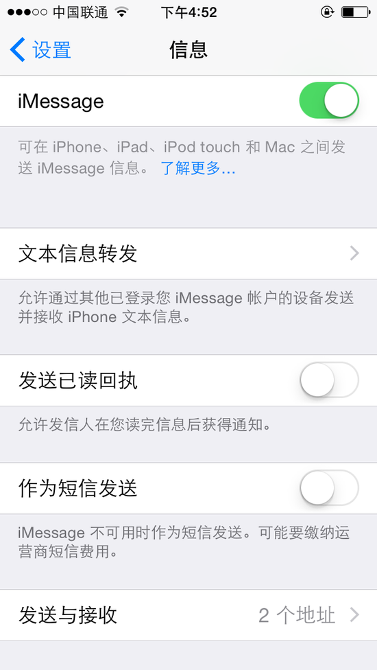 要解决这个问题很简单,比如你不想在iPad或者是iPod touch上接收iMessage信息,进入“设置”—“信息”,直接将iMessage的开关关闭。