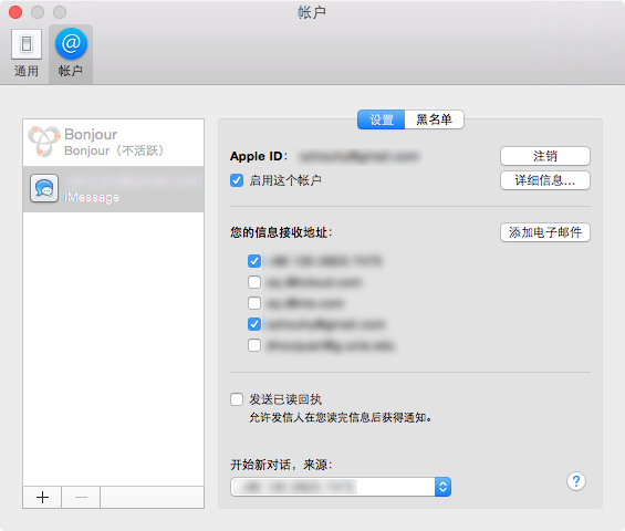 Mac“信息”—“偏好设置”打开“信息”后,点击屏幕左上角的“信息”,继续点击“偏好设置。。。”,确认Apple ID和iPhone中“发送与接受”的Apple ID一致。如果不一致,请选择注销,然后登陆iPhone“发送与接收”中使用的Apple ID。之后确认勾选“启用这个账户”。最后在“您的信息接受地址:”中至少选中你的手机号码和Apple ID使用的邮箱。