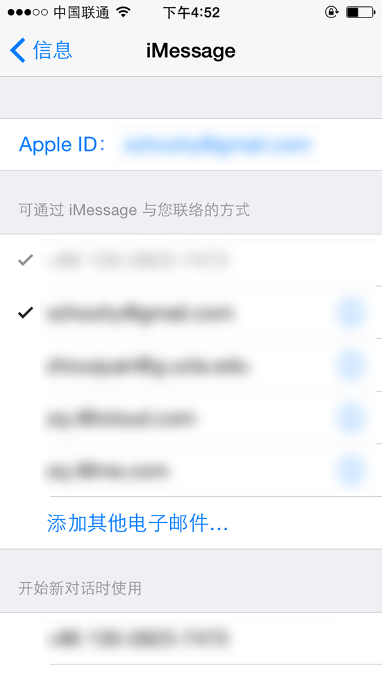 在“可通过 iMessage 与您联络的方式”里,至少勾选上你的手机号码和Apple ID所用的邮箱,一般来说手机号码是默认勾选,不用再做选择。