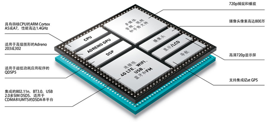 骁龙210解析图其中高通骁龙210是骁龙200系列最新作品。作为入门级四核芯片采用32位28纳米工艺制造;集成四颗Cortex-A7运算核心和Adreno 304图形处理器,整体性能入门级别,但2GB RAM对运行做了保障。