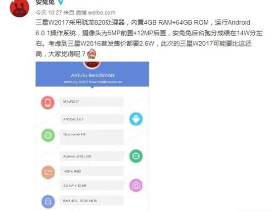 在国外跑分网站现身之后,三星W2017也国内跑分软件安兔兔进行了测试。通过安兔兔发布的配置信息来看,三星W2017确实搭载骁龙820处理器,内置4GB RAM+64GB ROM存储组合,升级不小。