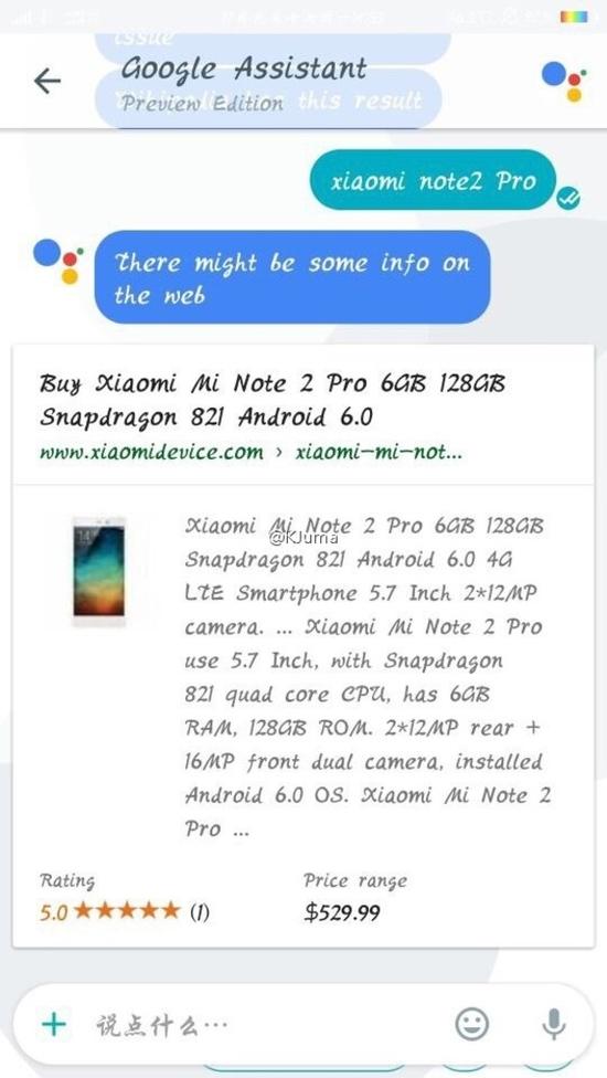 至于配置,爆料显示,小米Note 2 Pro搭载骁龙821处理器,采用5.7英寸双曲面屏,内置6GB RAM+128GB ROM,配备1200万像素双摄像头,以及1600万像素前置镜头,预装Android 6.0系统化,支持4G LTE网络。