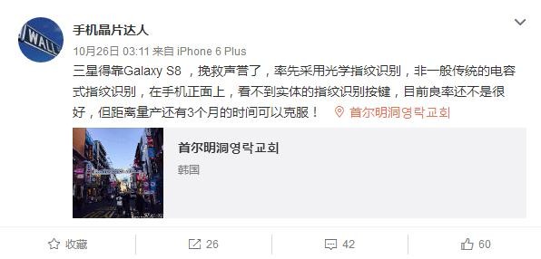 同时根据微博@手机晶片达人 的爆料,三星Galaxy S8将率先采用光学指纹识别,在手机正面是看不到这个指纹的实体键。