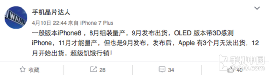 iPhone 8作为今年最重要的一款旗舰备受网友关注,不过大家如果想买到这款产品,等待的时间可能比预期的还要更长一些。此前分析师Brian White曾透露,采用OLED屏的iPhone 8仍会于9月发布或接受预购,不过发货日期有可能延长至数周之后。现在知名爆料达人@手机晶片达人进一步证实了上述信息,表示iPhone 8将会出现发布后三个月却无货的情况。