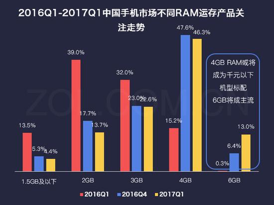 2016Q1-2017Q1中国手机市场不同RAM运存产品关注走势