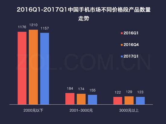 2016Q1-2017Q1中国手机市场不同价格段产品数量走势