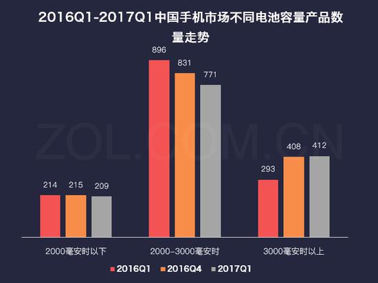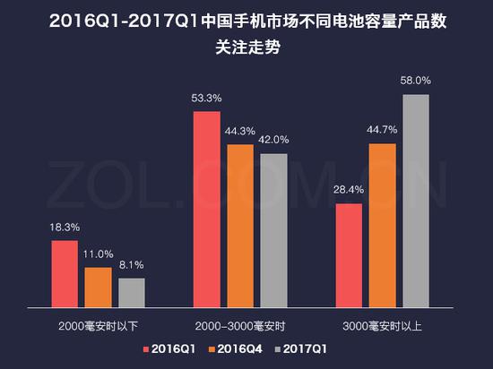 ZDC数据显示,2017Q1,搭载3000mAh以上容量电池的机型达到412款,而去年同期仅有293款,一年时间,增长了119款。与此同时,2017Q1,3000mAh以上大容量电池的机型受到用户的集中关注,达58.0%,同比大涨近30个百分点,环比增长13.3%,上涨势头强劲。