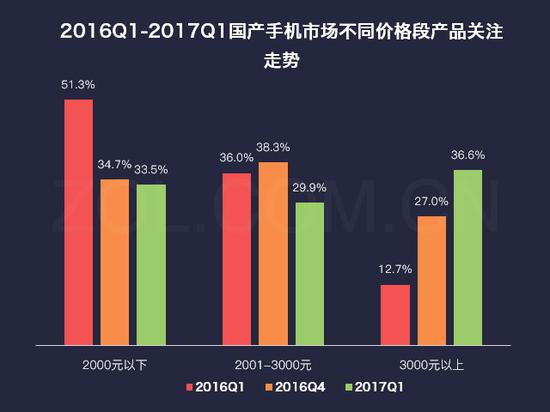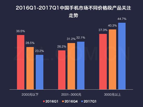 2016Q1-2017Q1中国手机市场不同价格段产品关注走势