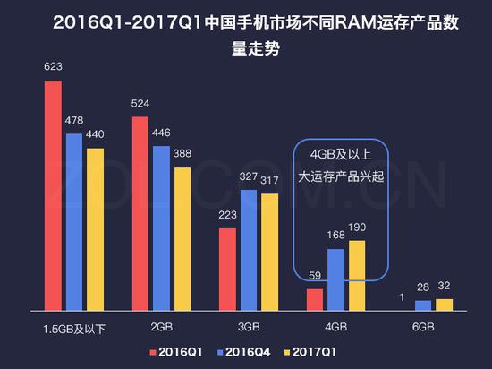 2016Q1-2017Q1中国手机市场不同RAM运存产品数量走势