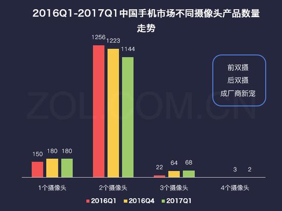 2016Q1-2017Q1中国手机市场不同摄像头产品数量走势