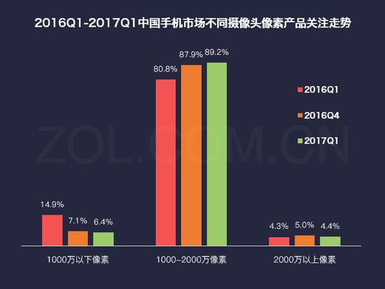 2016Q1-2017Q1中国手机市场不同摄像头像素产品关注走势