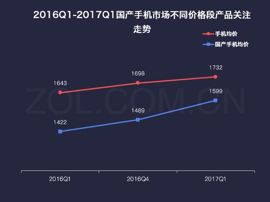 3000元以上机型数量及关注度的增加,带来的直接结果就是国产手机均价在2017Q1达到1599元,较整体市场均价仅低133元,较去年同期上涨177元,彻底摆脱了“低价”的标签。
