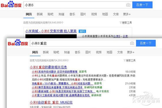 京东商城的评价系统中,给小米6差评的消费者也集中反映了上述提到的重启、WiFi断流和屏幕漏光的问题。此外,在百度搜索“小米6”有664万个相关结果,而搜索“小米6 重启”竟然有426万个相关结果,“小米6 WiFi断流”、“小米6 发热”的搜索结果也高达242万和440万。由此可见,小米6各种质量问题受到了广泛的关注。
