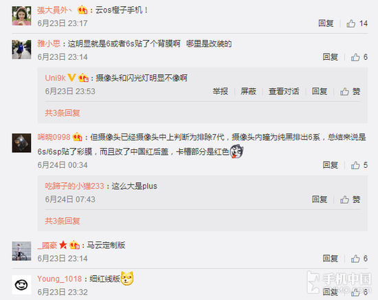 大体来看,马云用的这台手机无疑是出自苹果,所以只需从图片找出是第几代即可。对此,网友立刻变身柯南,纷纷推测马云用的到底是哪一款iPhone。有捣乱的说是“云os橙子手机”、“马云定制版”、“细红线版”……也有网友认真琢磨了一番,比如@唏晓0998表示:摄像头中上判断为排除7代,摄像头内瞳为纯黑排除6系,总结来说是6s/6sp贴了彩膜,而且改了中国红后盖,卡槽部分是红色。