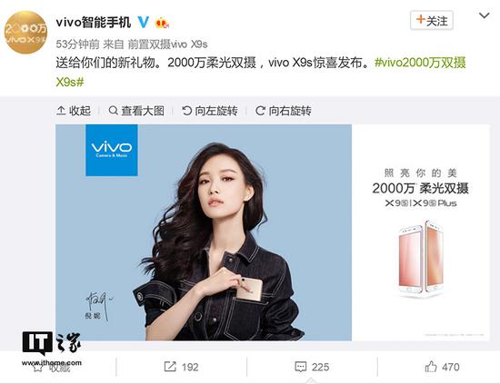 今天中午,vivo官方微博宣布vivo X9s、X9s Plus手机正式发布,倪妮代言,仍然是主打“2000万柔光双摄,照亮你的美”宣传语。
