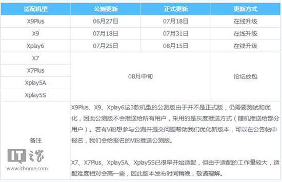 从图片上我们看到,包含vivo X9/Plus、Xplay 6、X7/Plus、Xplay5A/5S均在本次升级之列,涵盖了之前vivo发布的中高端机型,只有vivo X9/Plus以及Xplay6手机会通过在线升级的方式获得最新的更新,其他的机型将通过论坛发放更新包的方式更新。