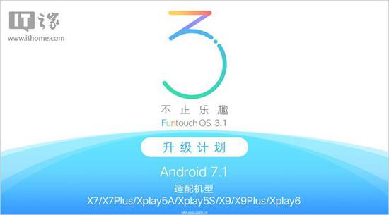 昨天下午vivo官方放出公告称,将在今年下半年为旗下多款机型升级升级Funtouch OS 3.1系统,本次更新最大的改进应该是升级安卓7.1系统底层适配,而这些机型大部分将直接从安卓6.0系统底层更新到安卓7.1。