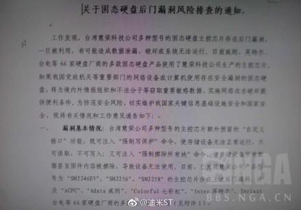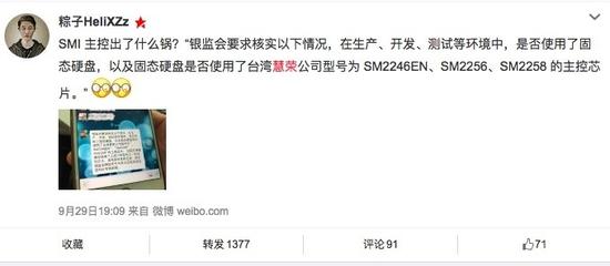 从百度贴吧、新浪微博、天涯社区等多个网站发现一则爆料:“银监会要求核实以下情况,在生产、开发、测试等环境中,是否使用了固态硬盘,以及固态硬盘是否使用了台湾慧荣公司型号为 SM2246EN、SM2256、SM2258 的主控芯片。”