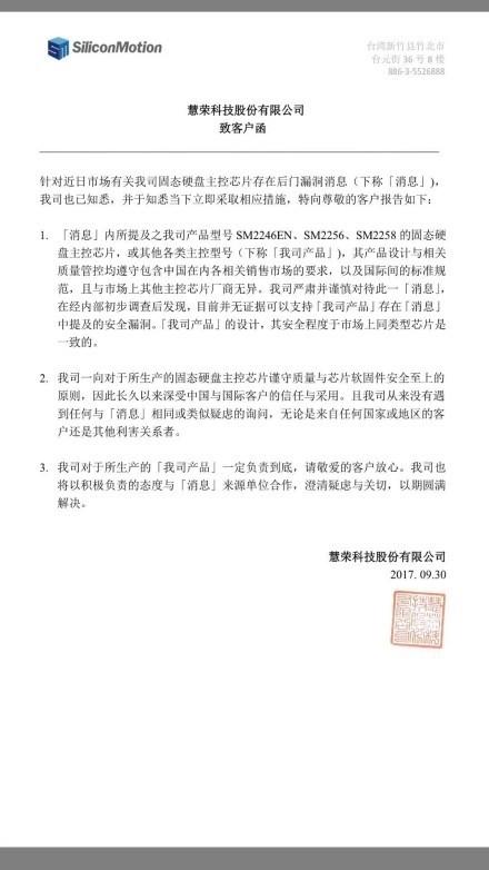 在上述函件中,慧荣称将与消息部门合作,但认为无证据支撑该消息中所说的产品有相关安全漏洞。该函件的收件人是“客户”,如果该函件属实,则该新浪微博用户的爆料可能属实——确实有相关部门在核查。不过,雷锋网编辑暂未从慧荣官网发现有此类函件的发布,同时并未从其他渠道交叉证明有此函件的存在,因此该函件真实性存疑。