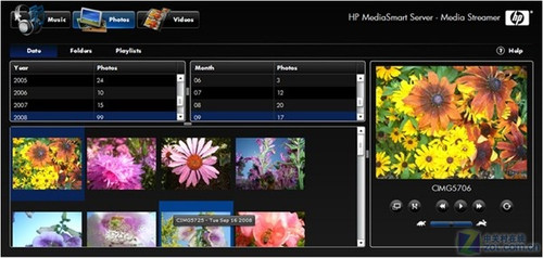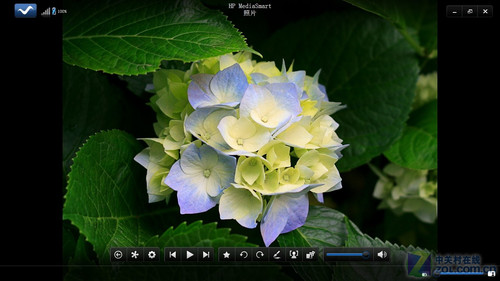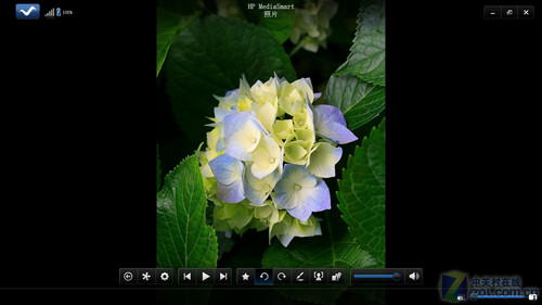在打开HP MediaSmart照片模式,点击SmartMenu上的“Photo”图标。我们就可以通过HP MediaSmart软件逐个浏览或用幻灯片展示的方式浏览JPEG格式的数码照片,同时也可编辑每张照片或打印照片。另外,在导航栏中,点击要查看的照片类别,然后点击要浏览的文件夹,会用网格视图显示所有文件夹内的所有照片,再点击某个照片可浏览或进行旋转、裁截、自动增强、修复红眼和添加标签等编辑应用。