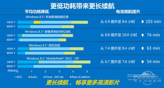 由于笔记本电池技术并没有什么突破性的创新或发展,所以目前提升笔记本续航时间的手段基本只能从降低功耗入手。Core M是当前功耗最低的笔记本处理器,仅为4.5W,要比第四/第五代酷睿i系列低很多(15W),所以Core M会提升笔记本的续航,但是增长并不会有太大,这是为什么呢?