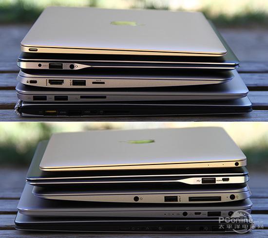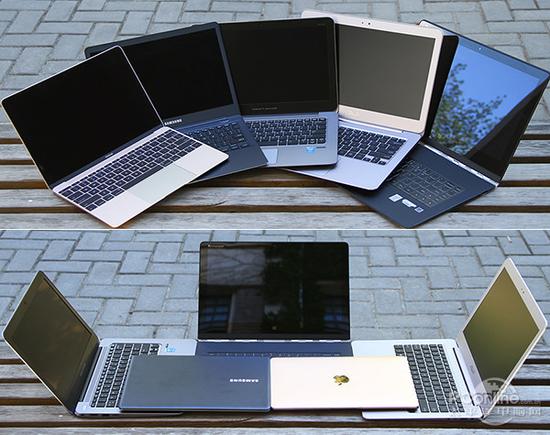 PS:图中产品由近及远依次为:三星ATIV Book 9,苹果新MacBook,惠普EliteBook 1020 G1,华硕ZenBookU305,联想YOGA 3 Pro,本排序是按照产品三围排行的。