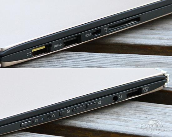 接口方面唯一需要介绍的就是电源与USB混合接口,也就是上图中黄色的接口,联想YOGA 3 Pro革新了电源接口设计形状,当未连接电源适配器时,可以充当第三个USB接口使用,这样它的USB接口数量也可以达到3个。由于YOGA 3 Pro还是一款二合一产品,它的一些控制按键也被设置在机身侧面,包含电源键、锁屏键、还原键等。