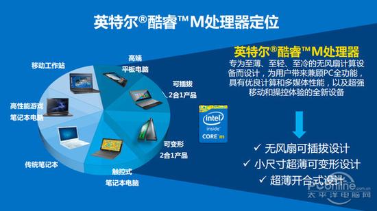 在这里还要提示大家一点,虽然Core M也是使用“酷睿”这个称呼,但是它与英特尔酷睿i3/i5/i7的“酷睿”并不同,它不属于酷睿系列,英特尔是将其作为独立的产品线存在,这其实从它的定位也能看出,性能处于Bay Trail与酷睿i之间。