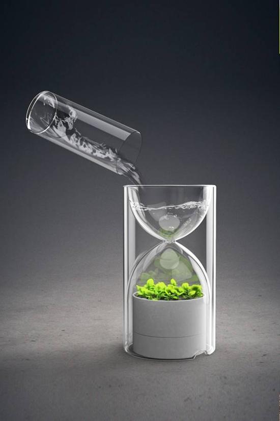设计师的灵感来源于沙漏,将双层玻璃的沙漏外罩盖在盆栽上,然后将水倒入沙漏的上层,水滴慢慢地滴入盆栽里,让植物时刻滋润着。微小多次的沙漏式浇灌方式,使植物不会过度浇灌又不会导致缺水。倒满一次水足够使用一星期。