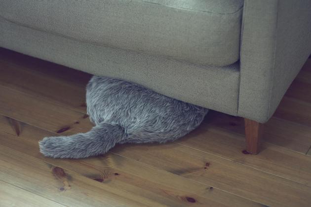 甚至把它藏在沙发底下,假装那里真的躲着一只猫:
