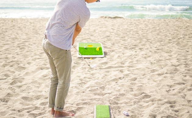 表面有人造的模拟草坪游戏规则也很简单,从30英尺外(约合9米)击球,球落在粗糙的“草坪”上获得1分,落到球洞附近草坪得3分,进洞则得5分。