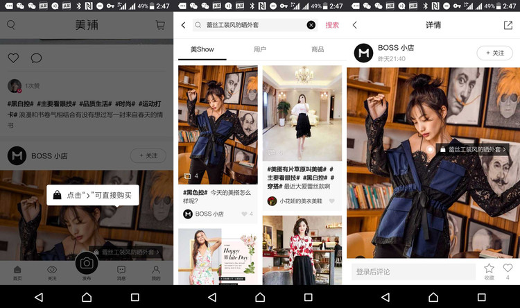 首次进入App,美铺会提示你点击标签能直接购买,社交电商大家都懂的。但是接下来发生的就有点奇怪了——点击那个商品标签之后进入的是一个瀑布流界面,并不是我期待的商品购物页。而在瀑布流里再点击同款商品,又回到了让你点击商品标签的地方。最终你会在上图的后两页之间无限循环,永远不能买到这个“类似工装风防晒外套”。虽然这是个小BUG,但能在首发版本的用户引导上出错,应该不是一般的失误。