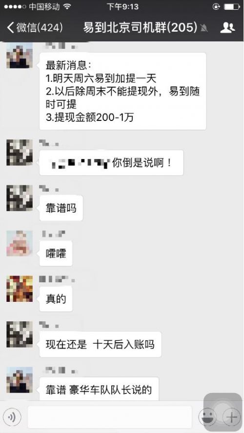 TechWeb从易到北京司机群中了解到,很多司机在当天都提现成功,提现金额几百元到上万元不等,有一位曾多次提现失败的司机感慨,“终于提现成功了,像过年一样开心。”